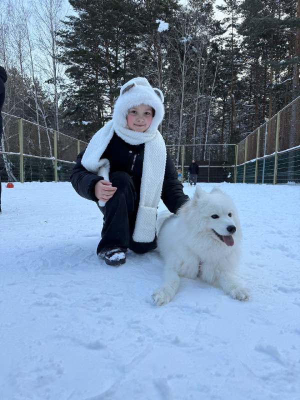 Пушистый самоед оказался отличной моделью для фотосессии и компаньоном во всех играх. Дети играли с собакой на снегу, а самые смелые смогли освоить простые приемы дрессировки под присмотром хозяйки.